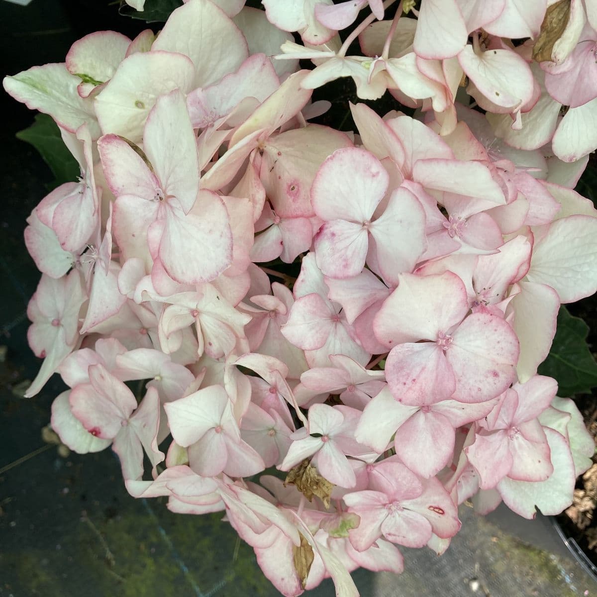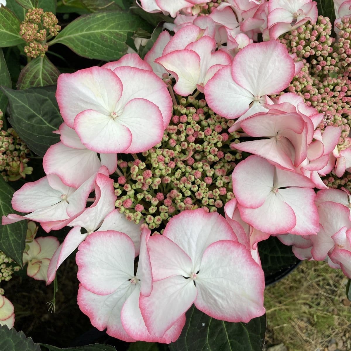 Hydrangea macrophylla Charm is a strong growing well branched hydrangea with dark green leaves. Beautiful flat bicolour lace cap cream white flowers rimed with pink in summer. Flower colour is dependant upon soil pH flowers are rimmed lilac blue on acid soils. Part shade conditions.